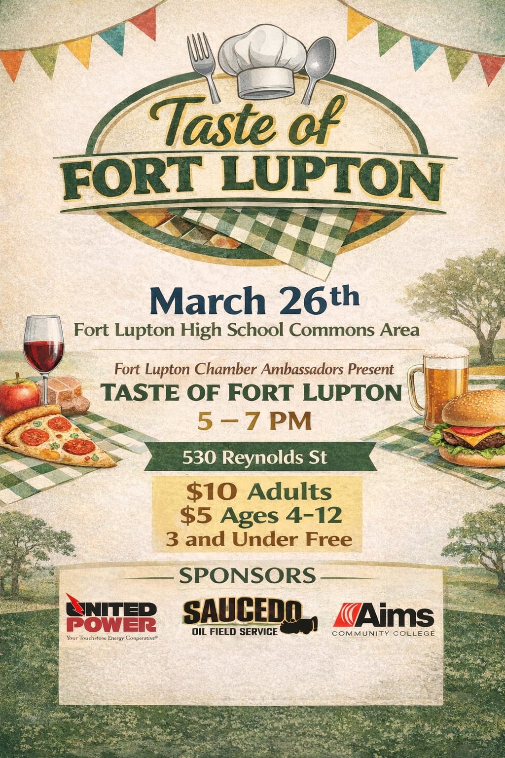 The Taste of Fort Lupton returns Thursday, March 26th, 2026, from 5:00 PM–7:00 PM at the Fort Lupton High School Commons Area.